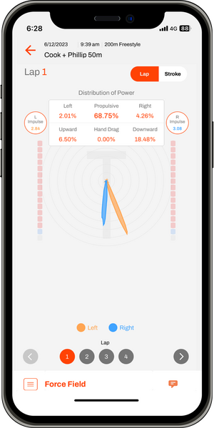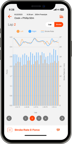 泳ぎの合計力とストローク率をラップ毎、ストローク毎に切替え表示します。