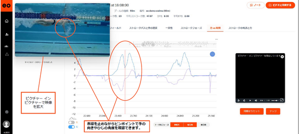 撮影したビデオと同期し、実際に泳いでいる映像とデータをリンクさせ動作の改善点を直感的に把握することができる。