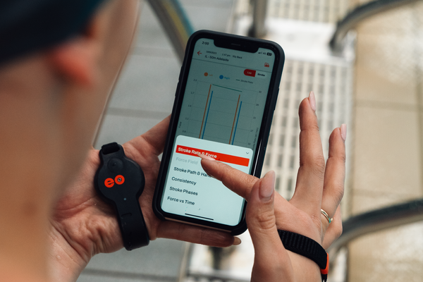 eo SwimBETTERは、慣性計測装置(IMU)を搭載した水泳用データ測定デバイスで、手のひらに装着することで、それぞれの手が加える6方向(推進力、抵抗力、上下左右)の力を1秒間に50回測定し、手の速度、向き、角度、ストロークの軌道をリアルタイムに可視化することが可能です。