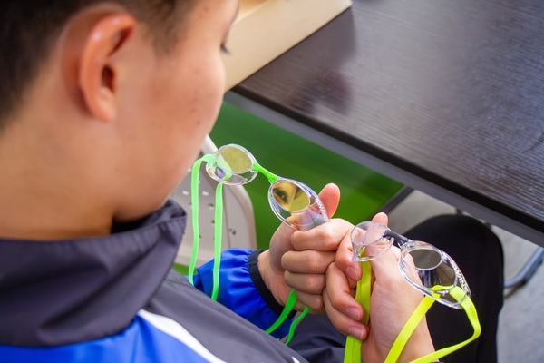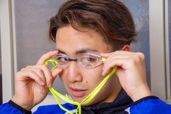 今福選手の代名詞にもなっているのがクリアレンズ。裸眼に近い明るさが得られるレンズカラーを選ぶ理由は、「息継ぎで顔を上げたとき、照明の影で暗くなりやすい観客席までしっかりと見たいから」とのこと。