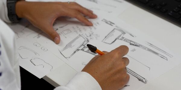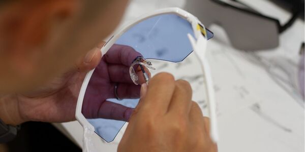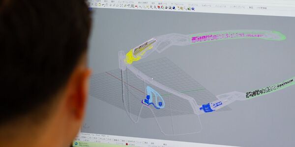 「大型成型平面レンズ」を搭載した試作品を用いてヒアリングを実施すると、従来のサングラスよりも縦幅があるため頬にレンズが接触、また縦のカーブがないためまつ毛が接触しないようにレンズを遠ざけると上部に隙間ができて光が侵入する、という問題が発生。角度調整が可能なラチェット機構をフレームに搭載することでこの問題をクリアし、日本人の顔に合う「大型成型平面レンズ」を実現しました。