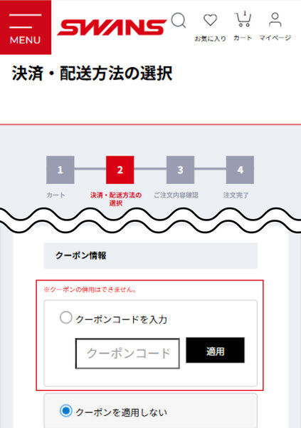 ・会員ログイン後、「決済・配送方法の選択」画面のクーポン情報欄にクーポンコードを入力してください。
