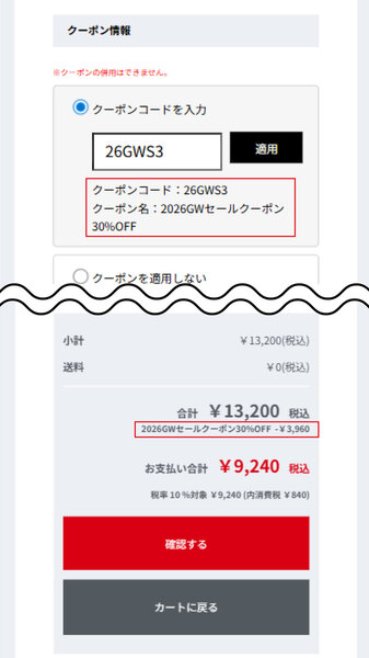 「30%OFFクーポン」と「10%OFFクーポン」を同時にご使用できません。