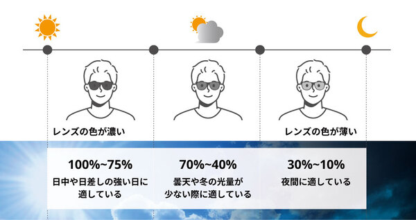 そのレンズの濃さを知るのに参考にするのが「可視光線透過率」になります。可視光線透過率とは、レンズを透過する光の割合のことで、レンズが濃くなる(眩しさを抑える効果が高いレンズ)ほど、可視光線透過率は低くなり、レンズが薄くなる(光を通しやすいレンズ)ほど、値は高くなります。