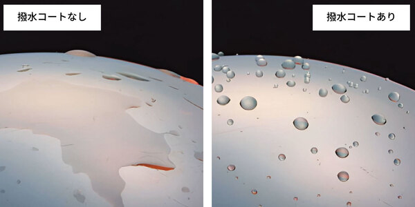 水、塵、ホコリをはじき、クリアな視界を確保する撥水・防汚コーティング。レンズ表面の水滴だけでなく塵やホコリ、指紋などが付着しにくいコーティングで、クリアな視界を確保します。