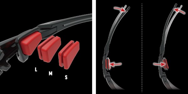装着者のこめかみを掴む(グラビング)サイドパッドと、連動して稼働するテンプル後端により頭部に密着。激しい動きに対してもブレを起こさない。