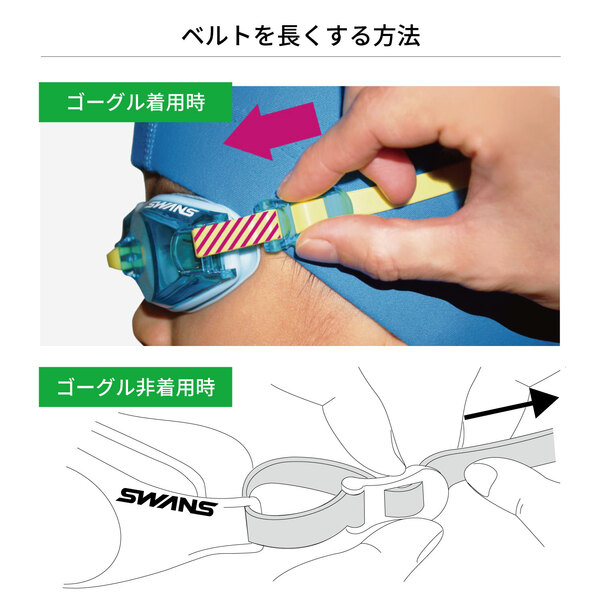 泳ぐ前には必ず、ゴーグルのベルトが耳の上をまっすぐ通っていることを確認し、後頭部でベルトの二股部分を上下に広げてください。ベルトが二本に分かれたレーシングゴーグルも同様に調整してください。